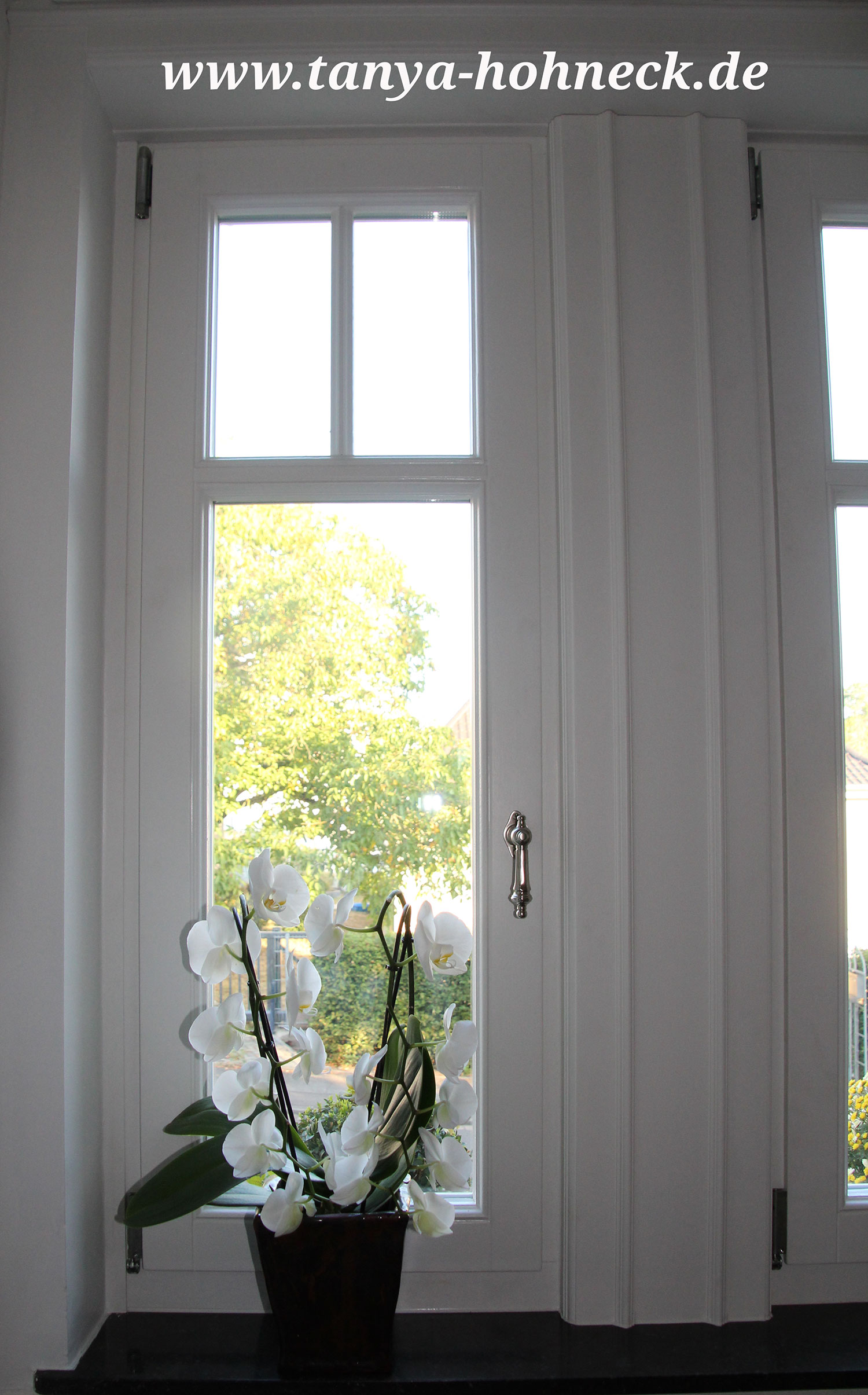 In diesem Sommer war es endlich soweit. Wir erfüllten uns den lang gehegten Wunsch nach neuen Fenstern für unser altes Haus. Während die übrigen Fenster alle ihre klassische Sprosseneinteilung behielten, wünschte ich mir für die Fenster im Erker einen Blickfang. Gemeinsam mit der Schreinerei Schiff aus Wadgassen suchte ich nach einer Lösung, die dem Raum zwar Behaglichkeit geben, diesen aber nicht dominieren oder gar optisch verkleinern sollte.