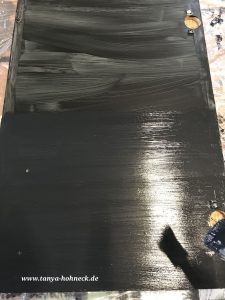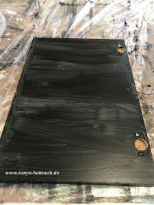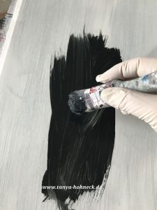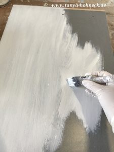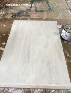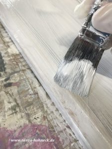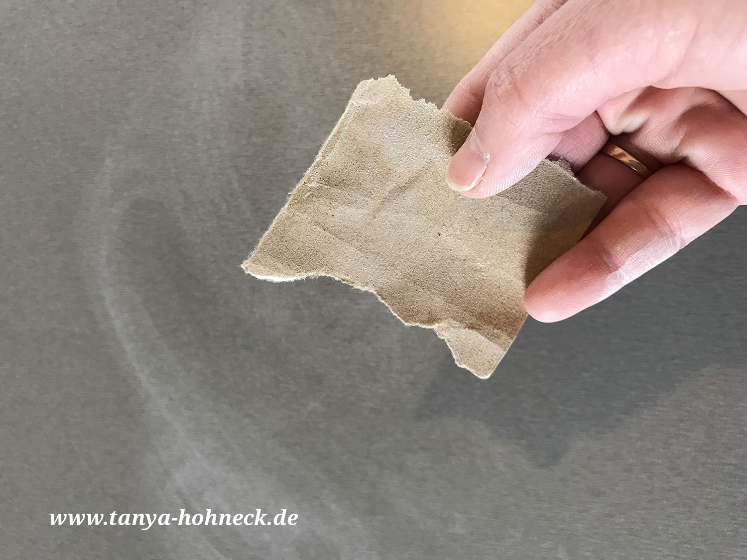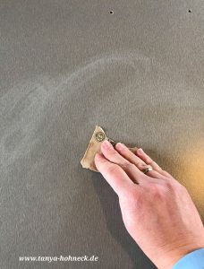- Tipp: entweder kreuz und quer arbeiten, wie ich das meist mache, oder wie hier im Projekt gleichmäßig in eine Richtung streichen. So entsteht der Eindruck einer Holzmaserung, die ja tatsächlich nicht vorhanden ist.