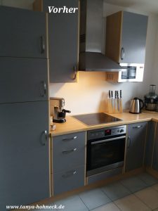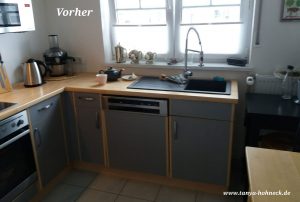 Man hätte noch überlegen können, die Arbeitsplatte und Sockelleiste zu streichen. Für die Arbeitsplatte hätte ich mir ein ‚Cement‘-Grau gut vorstellen können. Dies wäre mit Versante ebenfalls möglich gewesen. Allemal günstiger, als ein kompletter Austausch der Platte. Wenn ihr eine Arbeitsplatte streichen wollt, solltet ihr später in jedem Fall Untersetzer für heiße Töpfe und Pfannen verwenden. Eventuell würde ich eine Arbeitsplatte noch zusätzlich mit einem Fußbodenlack oder Klarlack schützen.