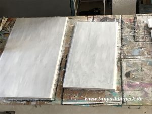 Ich habe hier extra mal ein Brett mit beiden Varianten bearbeitet, damit ihr den Unterschied zwischen Pinsel und Schaumstoffrolle seht. Der erste Farbanstrich (ganz links) ist grauslich. Hier konnte die Farbe noch nicht wirklich decken, da der Untergrund nicht saugfähig ist. Diesen lassen wir also außen vor.