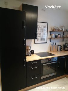 Nach einem vorsichtigen Rücktransport ins ‚traute Heim‘ konnten die Fronten behutsam montiert werden. Die Abzugshaube und ein Hängeschrank wurden entfernt. Stattdessen zieren nun ein Bild und ein offenes Regal die Wand. Das lockert ungemein auf. Die Schrankgriffe wurden ebenfalls ausgetauscht gegen neue edle Leder-Metall-Griffe. Schöne Griffe findet ihr jede Menge im Internet.