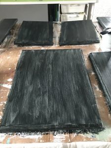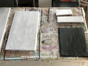 Mein Mann ist ja immer ganz platt, was ich alles in mein Atelier hinein und wieder raus bekomme. In diesem Fall quasi die gesamten Fronten einer Einbauküche. Dies war freilich der Idealfall, denn so konnten die Fronten zwischen den Arbeitsgängen in Ruhe im Atelier trocknen und störten keinen. Wenn ihr dies bei euch daheim vorhabt, arbeitet am besten in Etappen. Im Grunde braucht es dann nicht viel Fläche (ein paar große Pappkartons zur Unterlage). Ich höre auch oft von Kunden, sie möchten warten bis das Wetter schöner ist und man draußen streichen kann. Hier ist Vorsicht geboten, denn oft fliegen einem Blätter und Staub in den frischen Anstrich- besonders traurig, wenn man gleich ein Mandala-Muster aus Käfern und Fliegen in der frisch gestrichenen Schranktür hat. Also wenigstens überdacht sollte es draußen sein.
