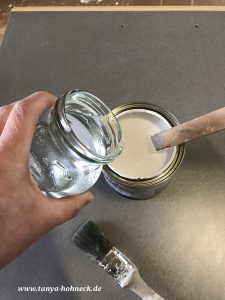 - Ich habe beim Streichen immer ein Wasserglas in Reichweite und gebe nur sehr wenig Wasser in den Farbtopf hinein. Lieber in Etappen verdünnen, als auf einen Schlag zu viel (geht auch bei Bedarf zwischendurch- falls die Farbe eindickt).