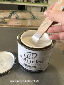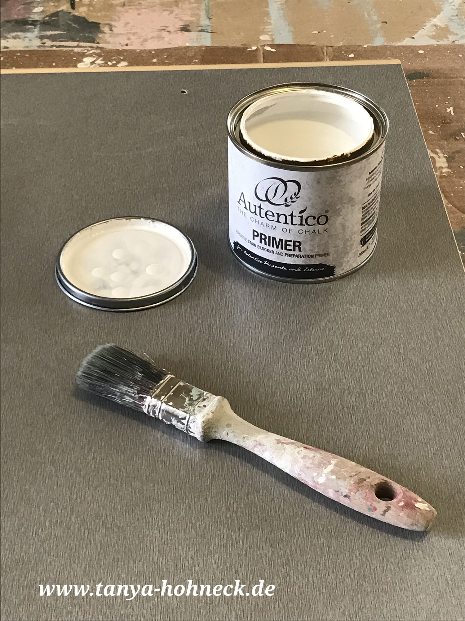Ich verdünne den Primer meist ein wenig, damit er streichfähiger ist. Das testet ihr am besten einfach mal kurz mit dem Pinsel auf der Oberfläche aus. Bei glatten Flächen, die nicht stark saugen, kann man manchmal sogar darauf verzichten. Stockt der Pinsel sehr, fügt ihr vorsichtig etwas Leitungswasser hinzu.