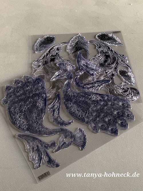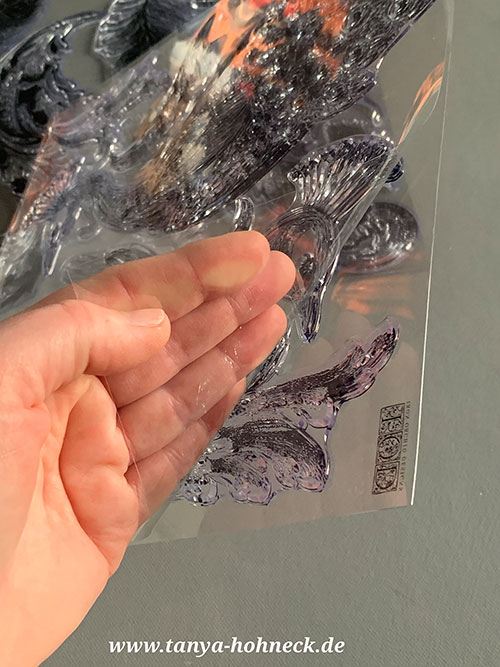 Tipp: Ich entferne nur die durchsichtige Deck-Folie und belasse die Silikonstempel-Motive auf der bedruckten Rückseite. So kann ich mir die einzelnen Teile des Motivs sehr einfach mit einer Schere zurecht schneiden. Dabei lasse ich immer ein wenig Rand stehen. Das erleichtert das Angreifen.