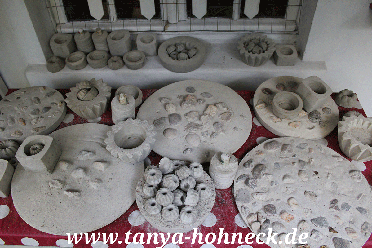 - Sommerspass: Betongießen mit Kindern, die Rohlinge vor der Bemalung mit Kreidefarbe